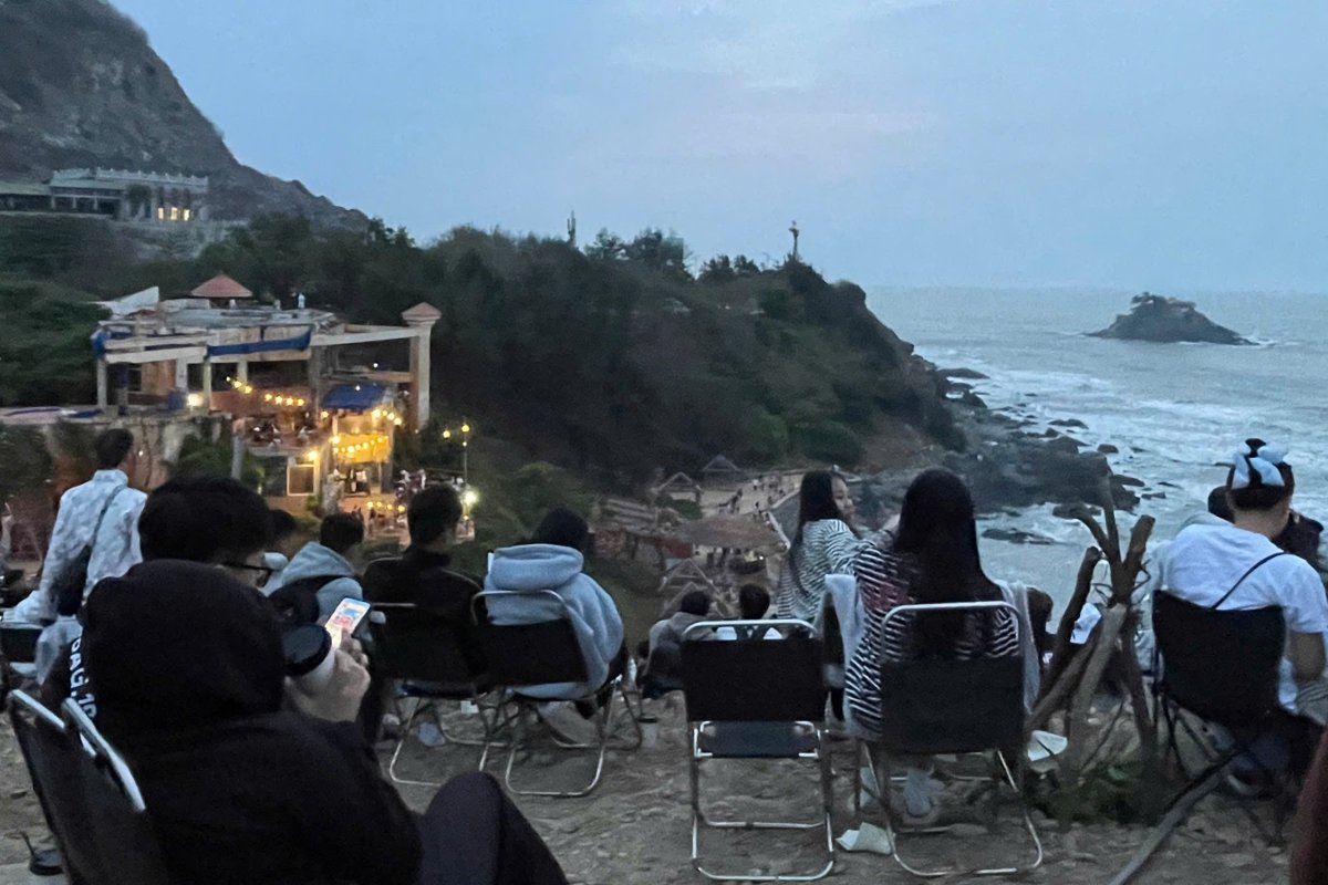 Từ khoảng 3h sáng, khu đất trống trên Mũi Nghinh Phong đã gần chật cứng khách. Các nhóm bạn trẻ đến sớm đã nhanh chóng chọn các vị trí đẹp. Có nhóm nhâm nhi ly cà phê nóng trò chuyện sôi nổi; có nhóm sử dụng điện thoại, chơi game... và cùng chờ đón cảnh tượng mặt trời mọc trên biển, trong không khí lạnh giá những ngày đầu năm mới.